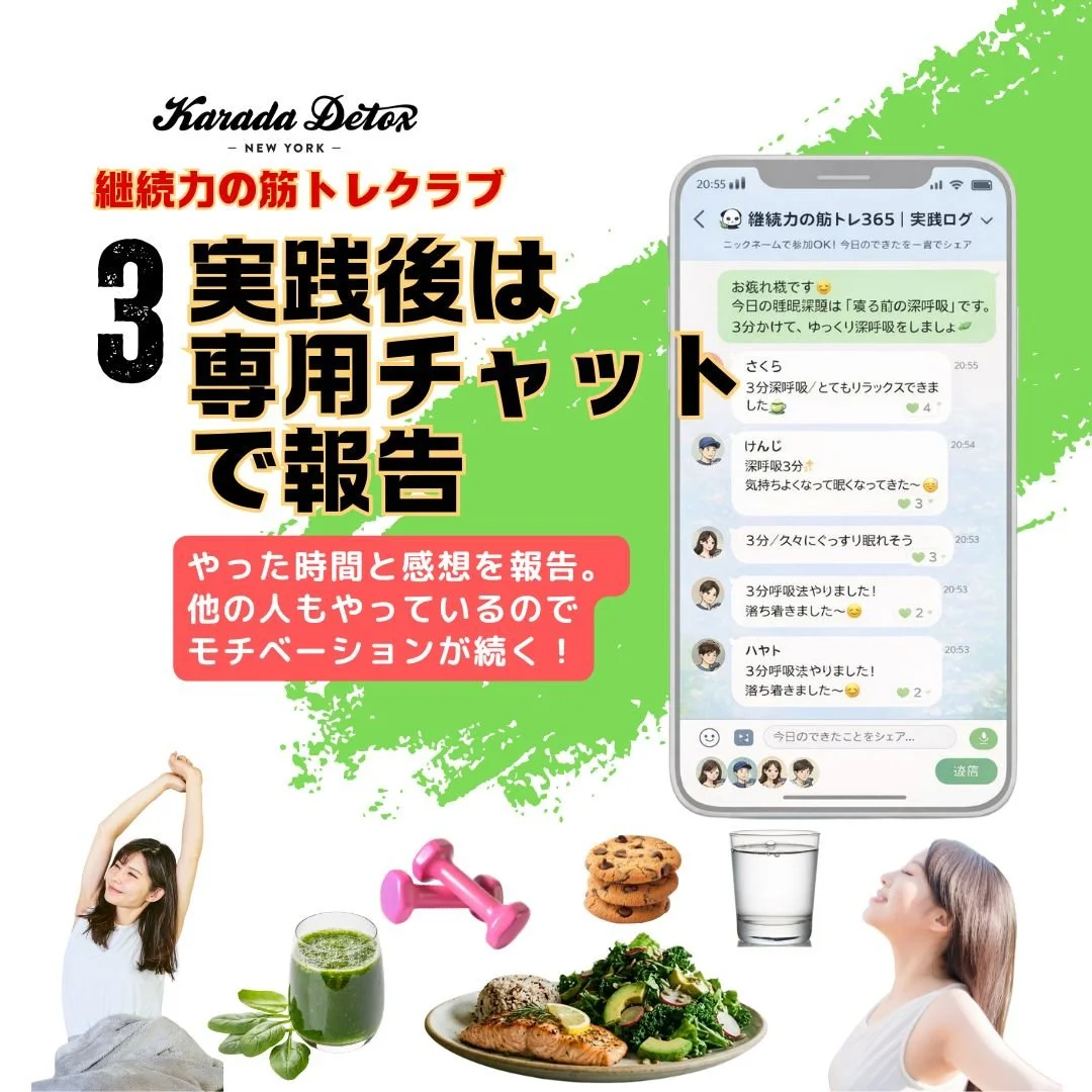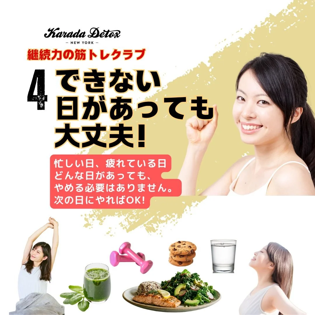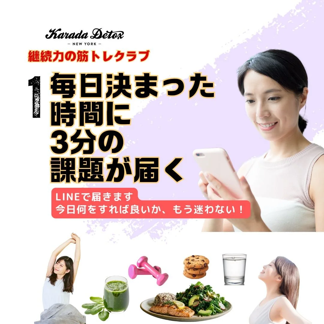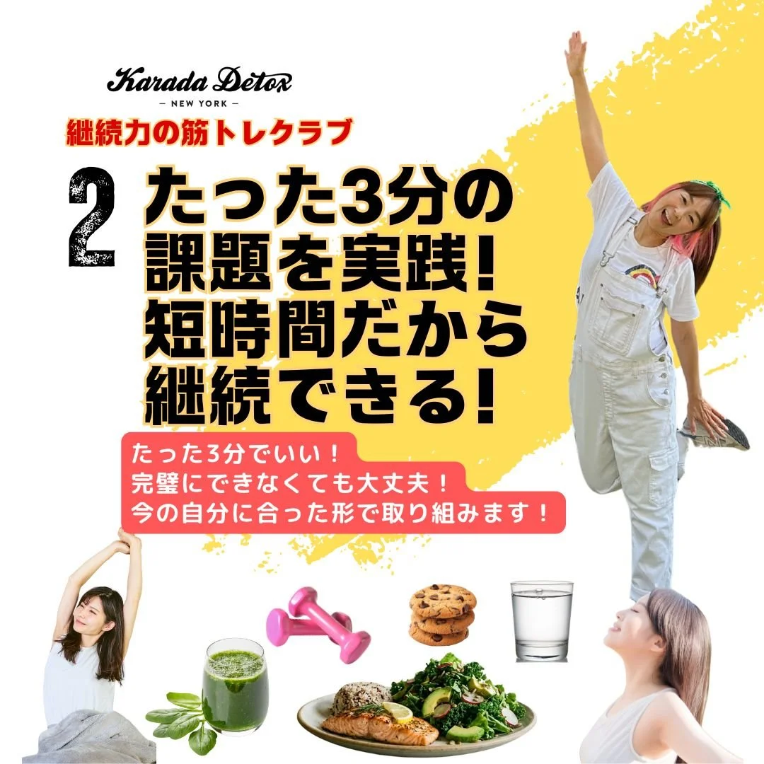ご自身の体調に合わせて調整をし、実践してください。(運動中の怪我などのトラブルについて、継続力の筋トレクラブを提供するKarada Detox LLCは責任を負いかねます。)
